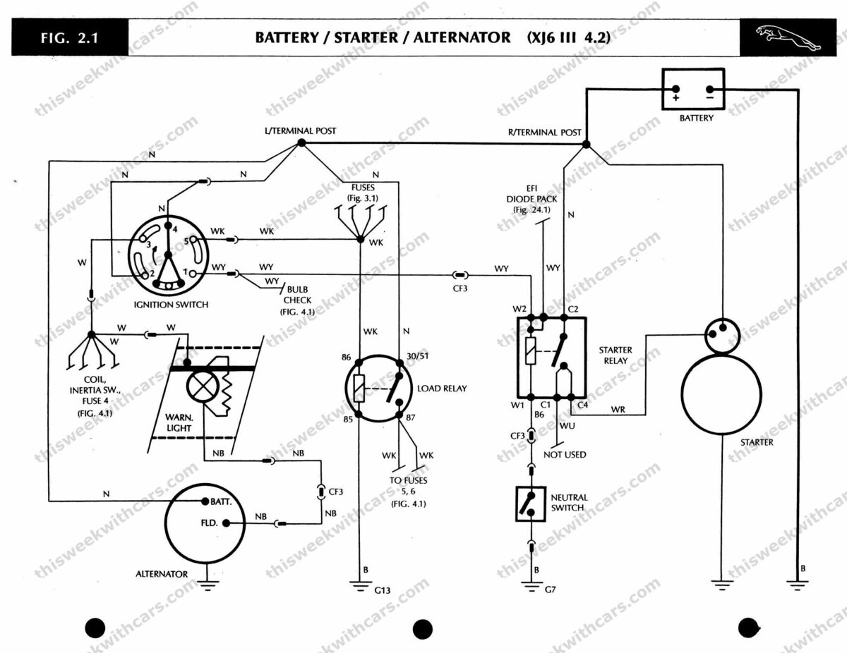Battery, starter motor, and alternator circuit — XJ6 III 4.2