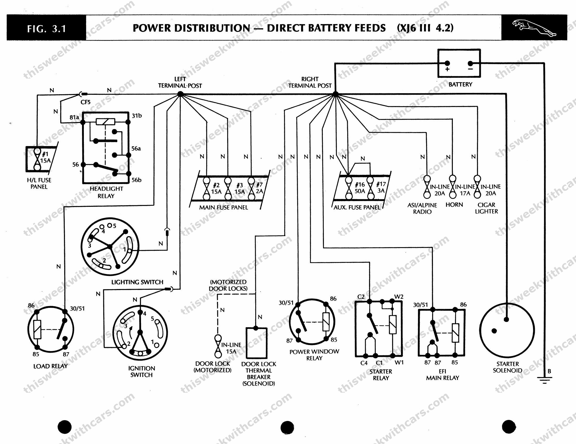 Power distribution and direct battery feed circuits — XJ6 III 4.2