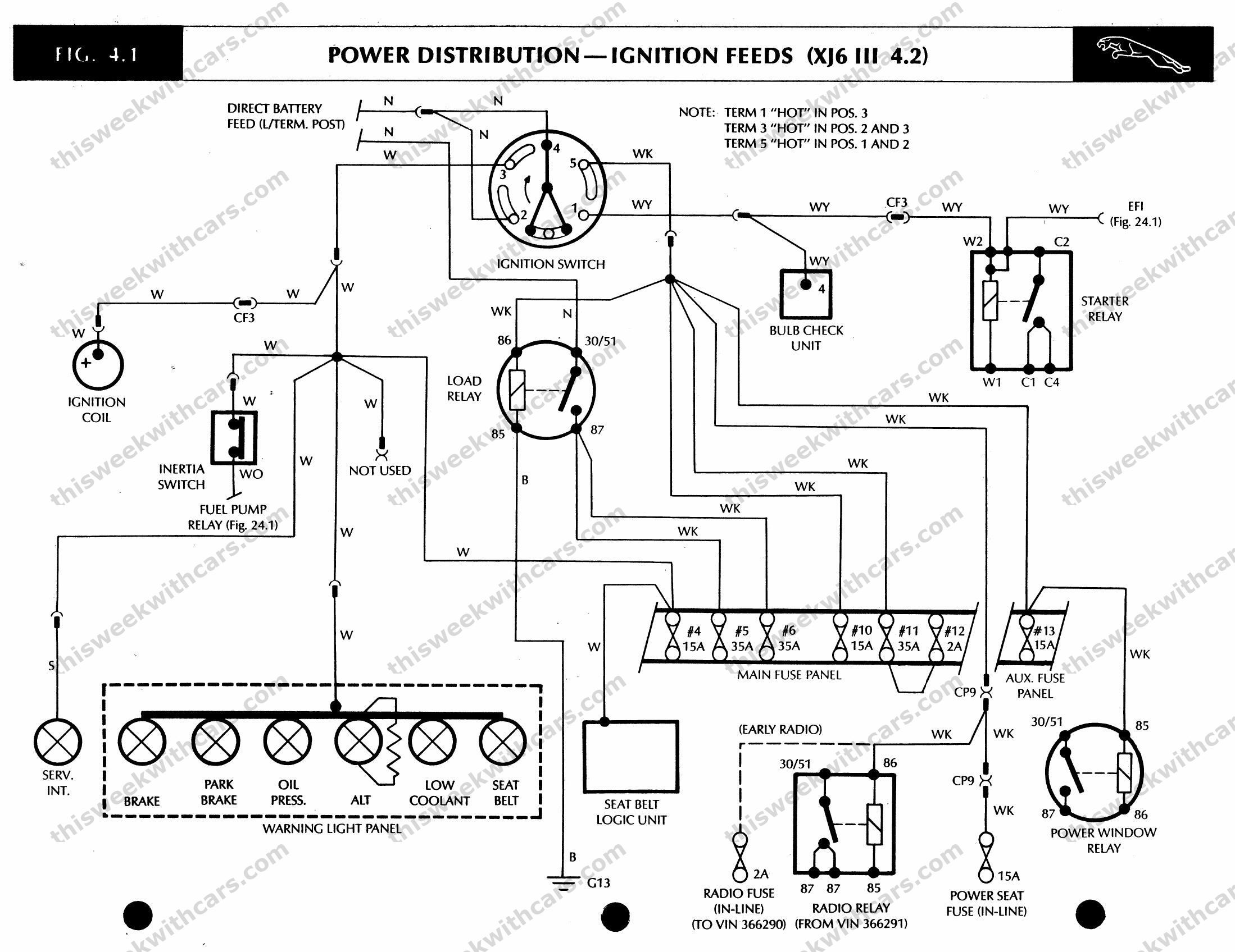 Ignition feed power distribution, warning lights, and fuse panel — XJ6 III 4.2