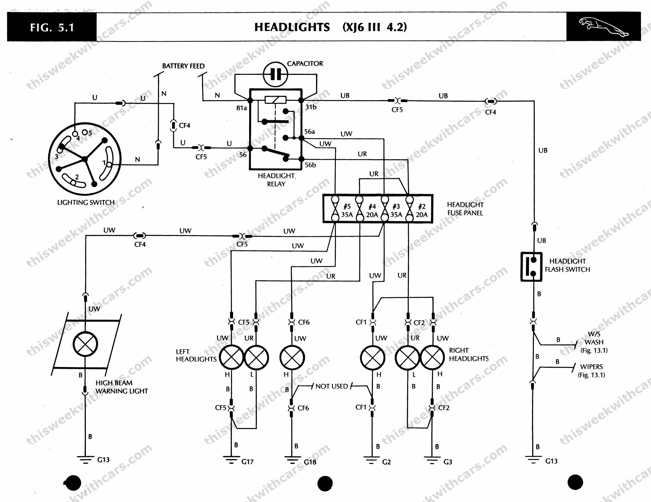 Headlight circuit with relay, fuse panel, and flash switch — XJ6 III 4.2