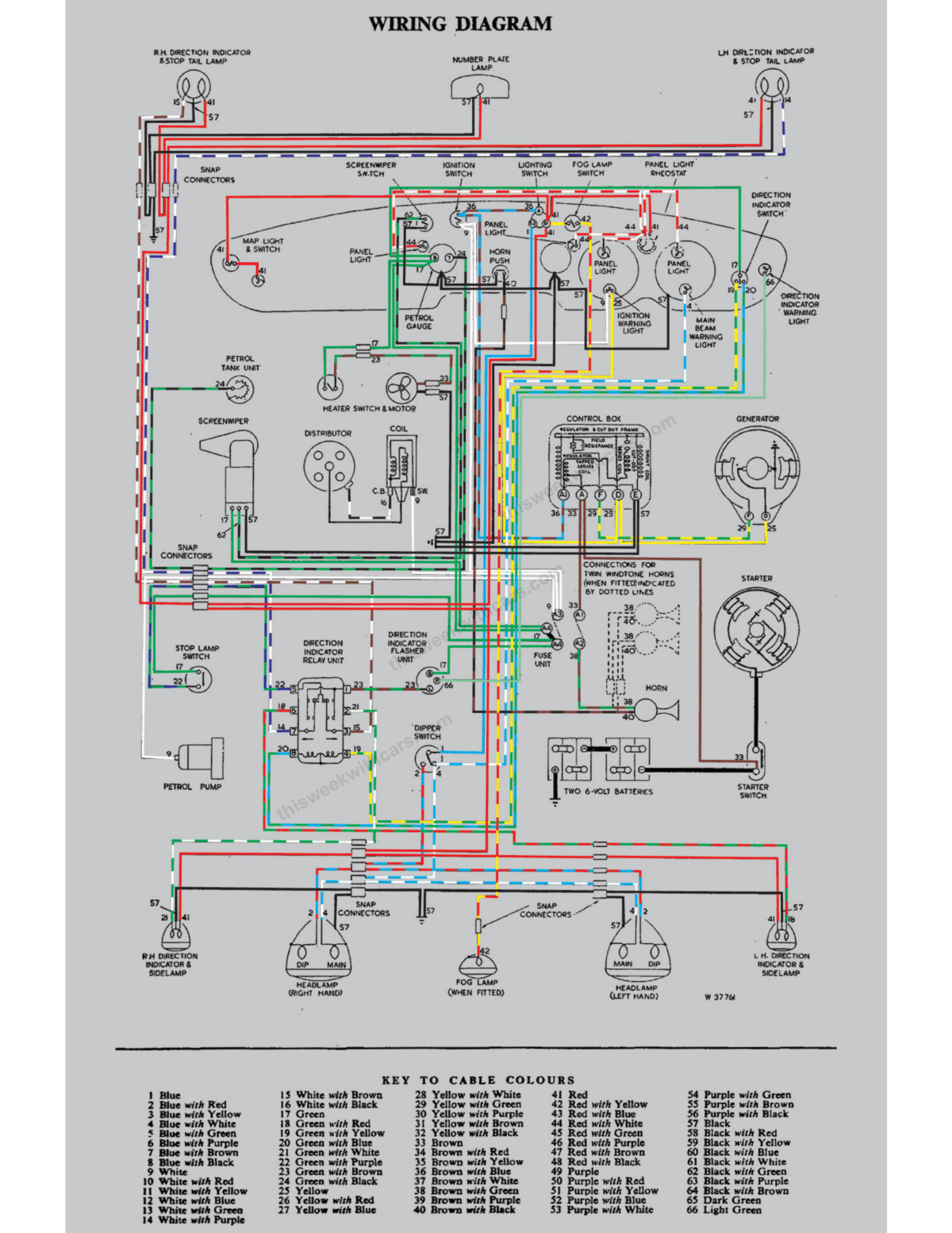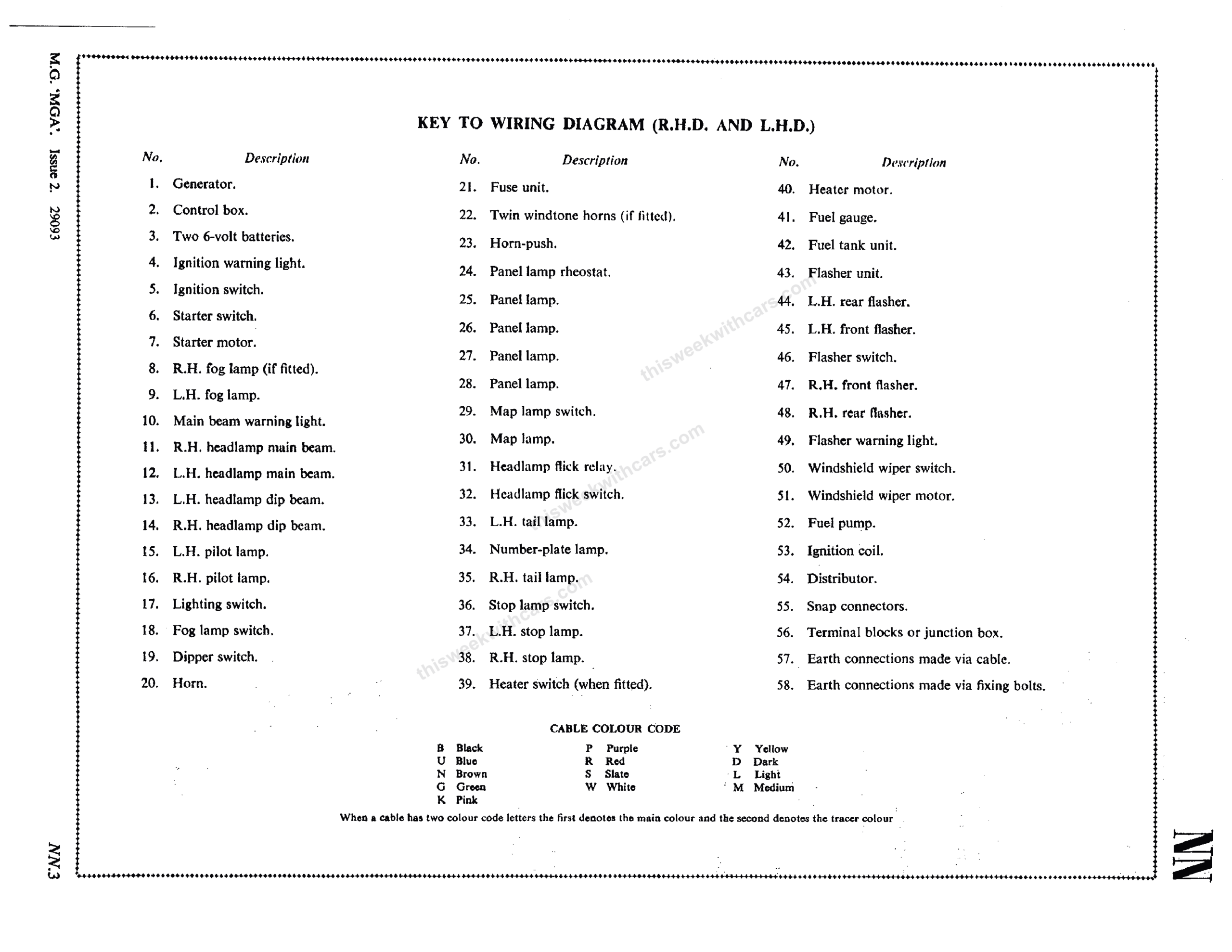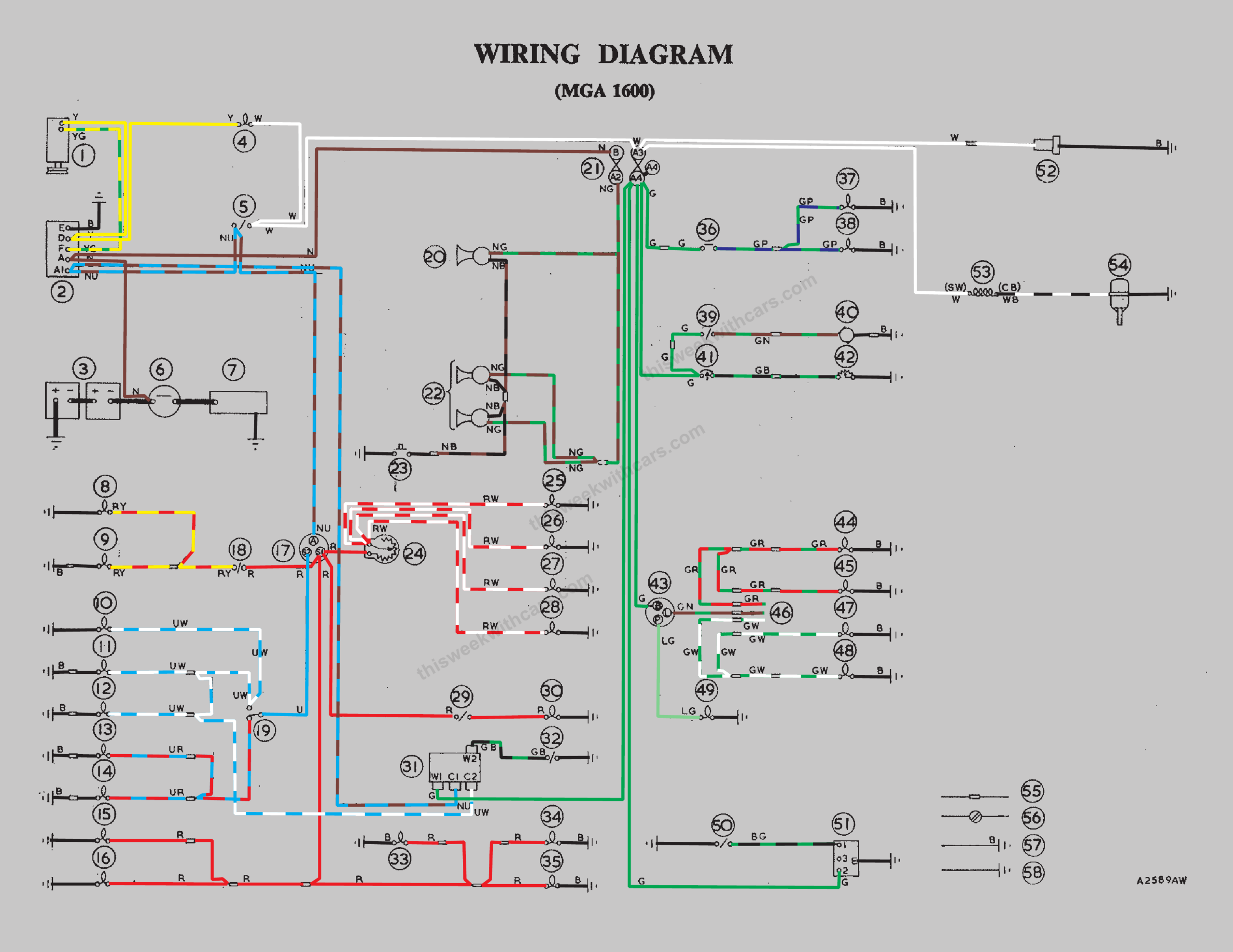 Color wiring diagram for the MGA 1500 with key to cable colours. Click any image to view full size.