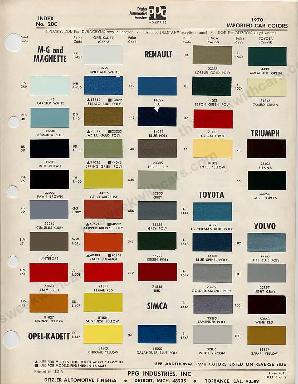 Paint Colors Factory paint color charts for Triumph vehicles. Click any image to view full size. Triumph Standard Colors Triumph 1970 Imported Car Colors PPG/Ditzler color chart with Triumph paint chips and codes for 1970. 1970 Paint Codes — Page 2