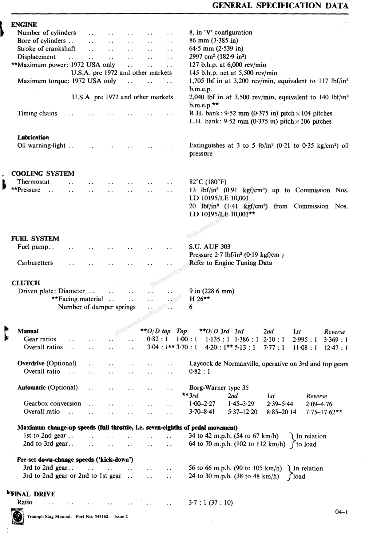 General Specification Data from the official Triumph Stag Workshop Manual.