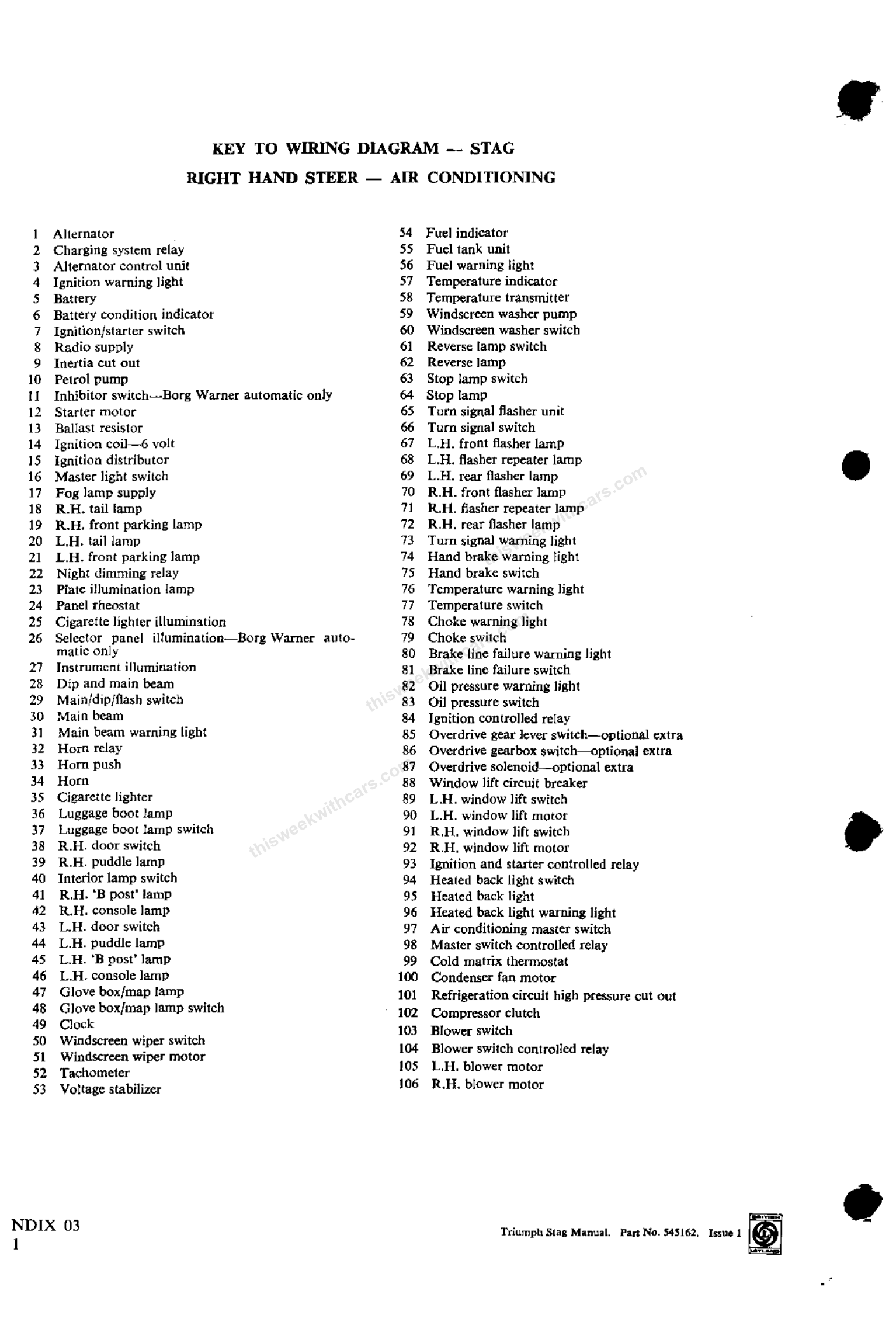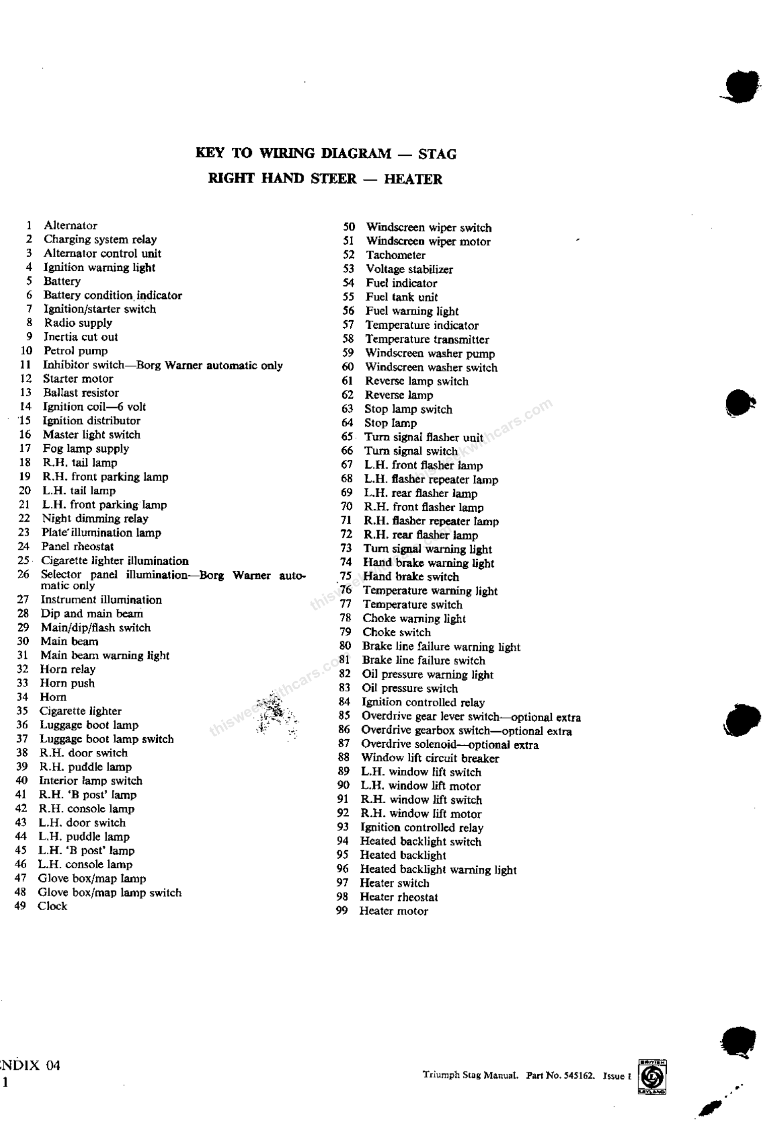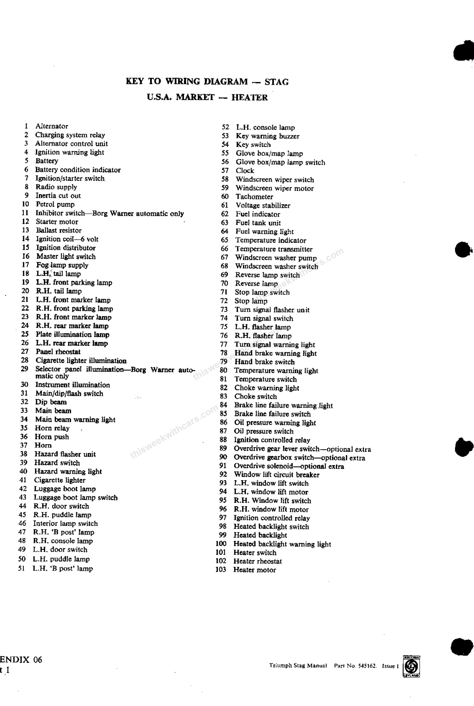 Triumph Stag Key to Wiring Diagram - R.H. Steer Page 1