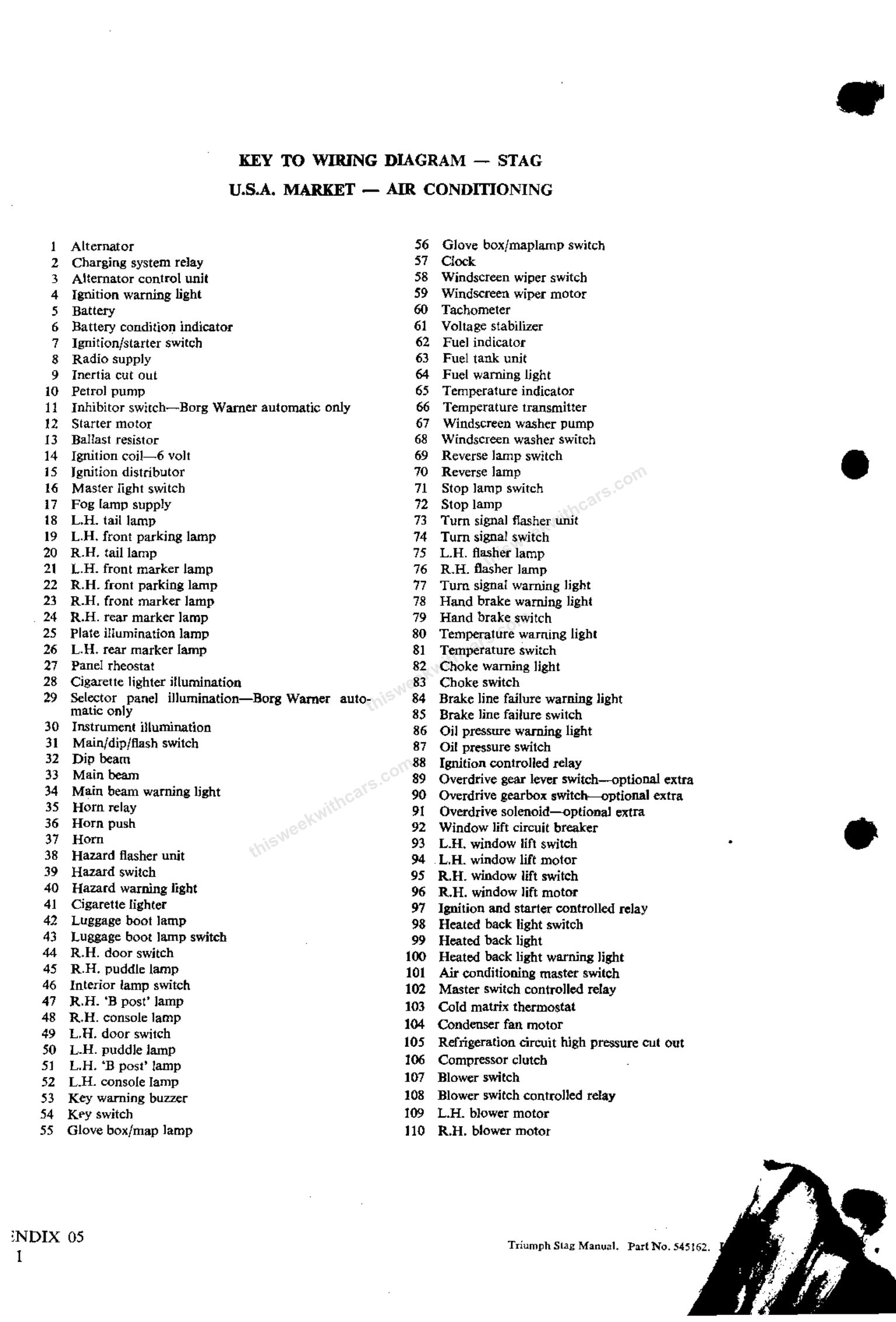 Triumph Stag Key to Wiring Diagram - U.S.A. Market Page 1