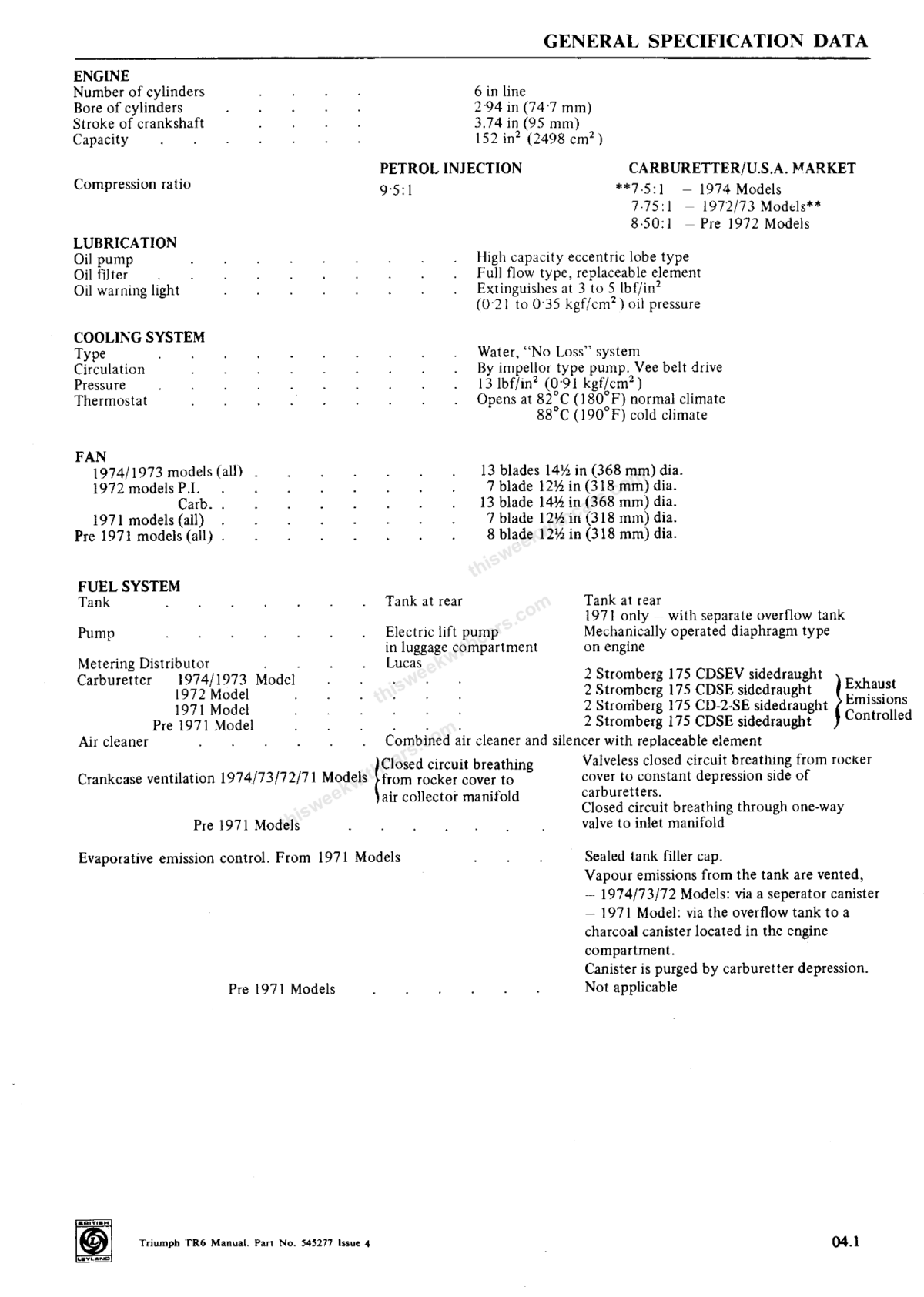 General Specification Data from the official Triumph TR6 Workshop Manual (incorporating TC and PI models).